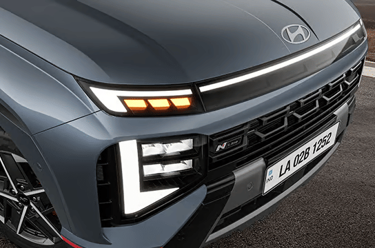 नया Venue N Line 2025 पहली नजर में ही अपने स्टैंडर्ड मॉडल से अलग दिखता है. फ्रंट में पूरी चौड़ाई में फैली डे टाइम रनिंग लाइट (DRL) स्ट्रिप और क्वाड बीम एलईडी हेडलैंप्स दिए गए हैं. हालांकि ये सेटअप स्टैंडर्ड Venue जैसा ही है, लेकिन नई ग्रिल डिजाइन और उस पर लगा N Line बैज इसे एक अलग पहचान देते हैं.