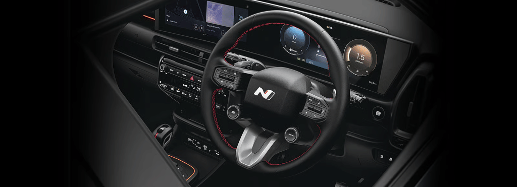 Venue N Line का इंटीरियर इसका सबसे आकर्षक हिस्सा है. यहां स्टैंडर्ड वर्जन की व्हाइट-नेवी ब्लू थीम की जगह अब ऑल-ब्लैक थीम दी गई है, जिसे रेड एक्सेंट और स्टिचिंग से सजाया गया है. डैशबोर्ड चौड़ा और सीधा रखा गया है जिससे कार का केबिन बिग-कार फील देता है. नया स्टीयरिंग व्हील अब ड्राइव और ट्रैक्शन मोड बटन के साथ आता है. साथ ही इसमें बड़े पैडल शिफ्टर्स और रेड स्टिचिंग दी गई है.
