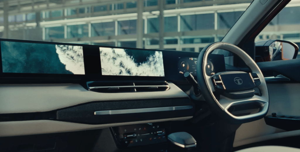 Tata Sierra के अंदर पहली बार कंपनी का ट्रिपल-स्क्रीन लेआउट देखने को मिलेगा, जो है डिजिटल इंस्ट्रूमेंट क्लस्टर, सेंट्रल इंफोटेनमेंट स्क्रीन और को-ड्राइवर डिस्प्ले. डैशबोर्ड का डिजाइन नया है और वर्तमान Safari व Harrier से अलग है, हालांकि HVAC कंट्रोल्स, गियर सिलेक्टर और स्टीयरिंग व्हील परिचित दिखते हैं.