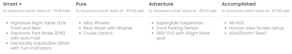 | Kryojet (Diesel) Smart+ MT – ₹12.99 लाख Pure MT – ₹14.49 लाख Pure AT – ₹15.99 लाख Pure+ MT – ₹15.99 लाख Pure+ AT – ₹17.49 लाख Adventure MT – ₹16.49 लाख Adventure+ MT – ₹17.19 लाख Adventure+ AT – ₹18.49 लाख Accomplished MT – ₹18.99 लाख Accomplished AT – ₹19.99 लाख Accomplished+ MT – ₹20.29 लाख Accomplished+ AT – ₹21.29 लाख |