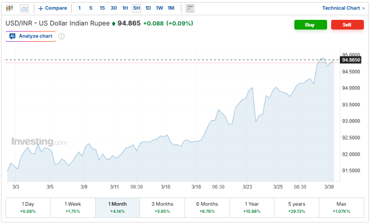वेस्ट एशिया में चल रहे युद्ध को अब एक महीने से ज्यादा हो चुका है. इस दौरान भारतीय रुपया लगातार दबाव में रहा है. पिछले एक महीने में रुपया कुल मिलाकर करीब 4.08% तक कमजोर हो गया है. वहीं पिछले एक हफ्ते में भी इसमें 1.76% की गिरावट देखने को मिली है.