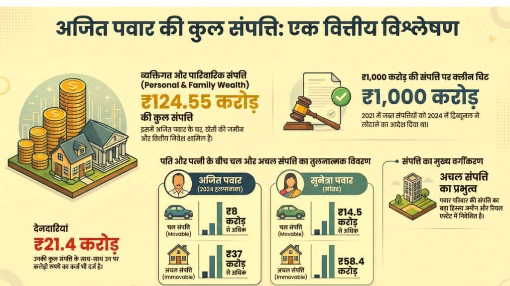चुनावी हलफनामे के अनुसार अजीत पवार की कुल संपत्ति करीब 124 करोड़ रुपये है. इसके साथ ही उन्होंने अपनी देनदारी भी घोषित की है. उन पर करीब 21 करोड़ रुपये का कर्ज बताया गया है. संपत्ति और देनदारी को मिलाकर उनकी वित्तीय स्थिति मजबूत मानी जाती है. वे महाराष्ट्र के सबसे संपन्न नेताओं में गिने जाते हैं.