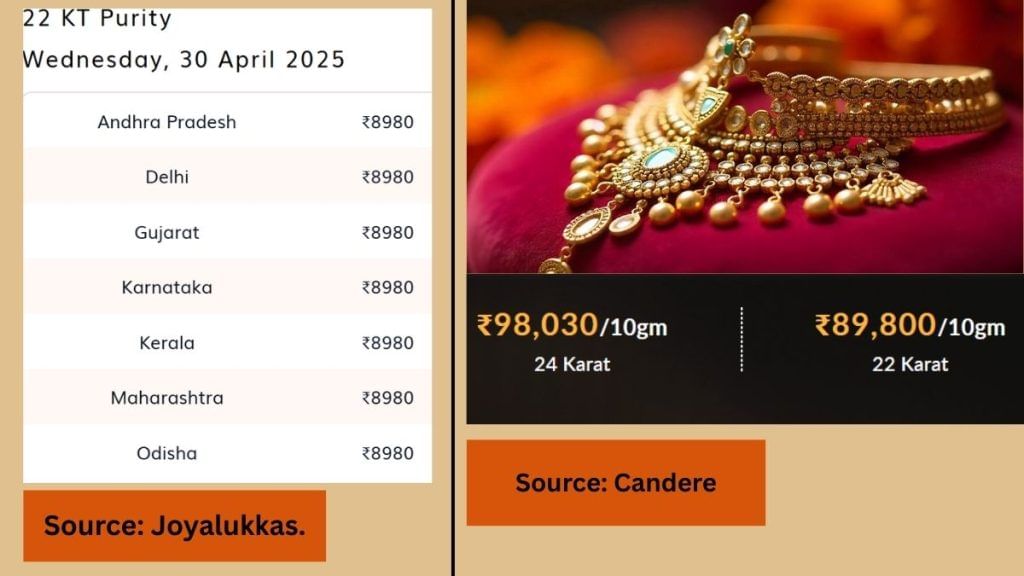 कल्याण ज्वेलर्स (Kalyan Jewellers): इसके Candere वेबसाइट के मुताबिक 30 अप्रैल को 24K सोने की कीमत 98,030 रुपये प्रति 10 ग्राम है, जबकि 22 कैरेट सोने के भाव 89,800 रुपये प्रति 10 ग्राम है. ये ब्रांड भी ग्राहकों को रिझाने के लिए कई तरह के ऑफर दे रही है.