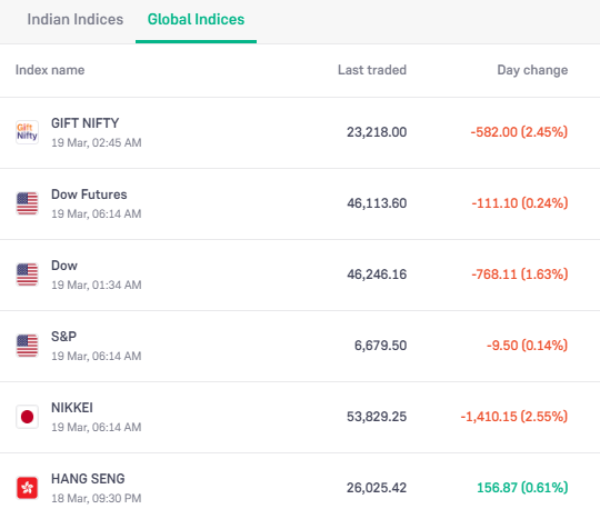 दुनियाभर के शेयर बाजारों में तेल की कीमतों में तेजी का असर साफ नजर आ रहा है. Gift Nifty करीब 23,218 पर 2.45% की गिरावट के साथ कारोबार कर रहा है. अमेरिकी बाजारों में भी दबाव दिखा, जहां Dow Futures 0.24% और Dow Jones 1.63% गिर गया. S&P 500 में भी हल्की कमजोरी रही और यह 0.14% नीचे बंद हुआ. एशियाई बाजारों में जापान का Nikkei 2.55% की बड़ी गिरावट के साथ दबाव में रहा, जबकि हांगकांग का Hang Seng थोड़ा मजबूत रहा और इसमें 0.61% की बढ़त देखने को मिली.