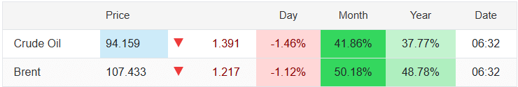 कच्चे तेल की कीमतों में हल्की गिरावट देखने को मिली है, लेकिन इसके बावजूद दाम अब भी ऊंचे स्तर पर बने हुए हैं. ताजा आंकड़ों के अनुसार, Crude Oil की कीमत करीब 94.15 डॉलर प्रति बैरल है, जिसमें दिनभर में लगभग 1.46% की गिरावट दर्ज की गई है.