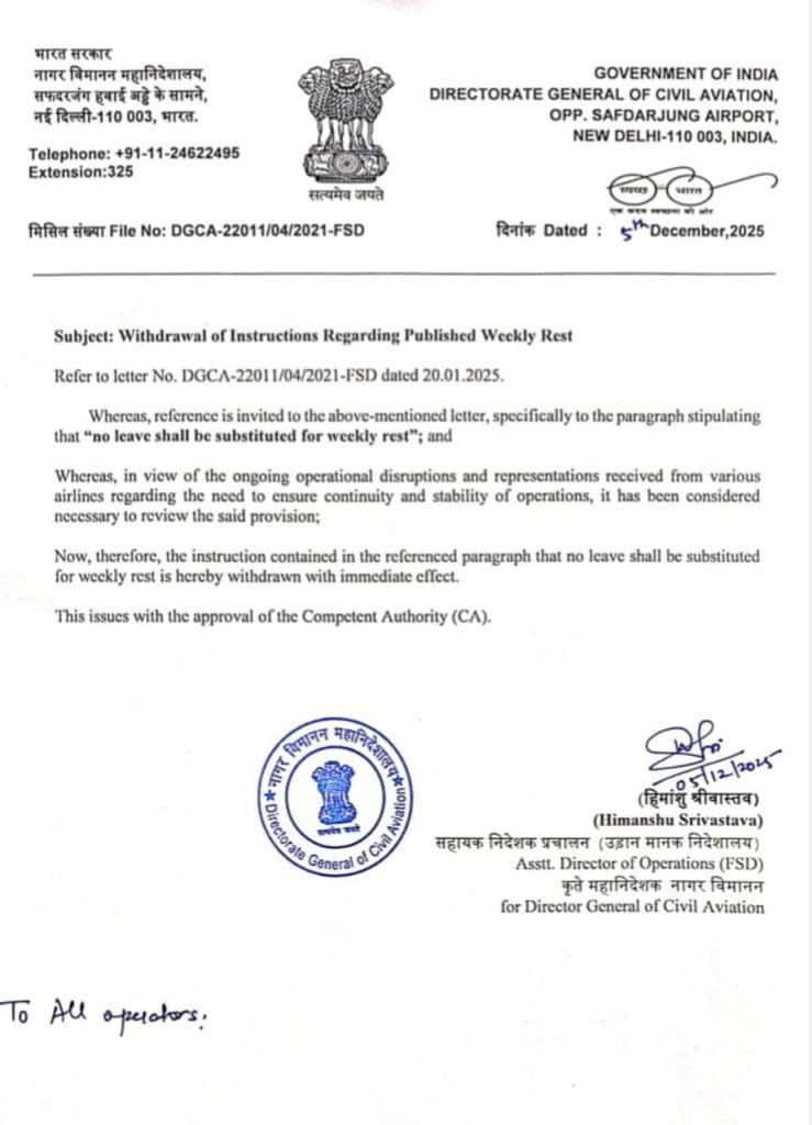 देश भर के एयरलाइंस के लिए राहत भरी खबर है. DGCA ने क्रू मेंबर्स से जुड़ा फैसला वापस ले लिया है. DGCA का कहना है, कि कई फ्लाइट्स के परिचालन में लगातार आ रही बाधा और एयरलाइंस से मिले आवेदन को ध्यान में रखते हुए वीकली हॉलिडे के फैसले को तत्काल प्रभाव से वापस लिया जाता है.