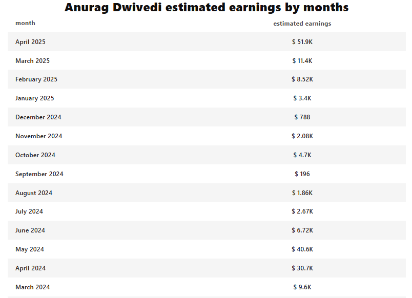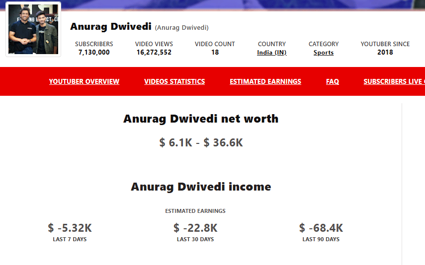 अनुराग द्विवेदी के यूट्यूब चैनल से जुड़ा डेटा बताता है कि उनके चैनल की शुरुआत 4 जुलाई 2018 को हुई थी और चैनल भारत से ऑपरेट किया जाता है. Youtubers.me के अनुसार, उनके चैनल पर कुल 7.11 M सब्सक्राइबर हैं, जबकि अब तक उनके वीडियो को करीब 1 करोड़ 64 लाख (16,272, 552) व्यूज मिल चुके हैं. कमाई की बात करें तो यूट्यूब पार्टनर प्रोग्राम के तहत उनकी अनुमानित मासिक कमाई सिर्फ 225 डॉलर बताई जाती है. अगर इसे भारतीय रुपये में बदलें, तो यह रकम करीब 20,250 रुपये प्रति माह होती है. अनुराग द्विवेदी की नेटवर्थ $36.6K है. उनकी असली कमाई स्पॉन्सरशिप से होती है. यही वो कमाई है, जिसके जरिए वे करोड़ों की लग्जरी कार, महंगे घर और क्रूज पर शादी जैसे काम कर पाते है.