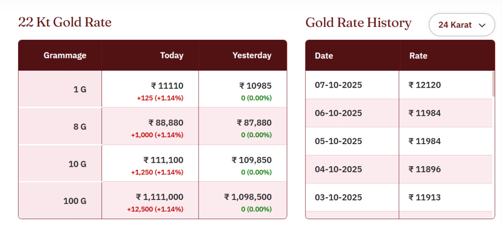 तनिष्क की वेबसाइट पर 7 अक्टूबर को 24 कैरेट गोल्ड के भाव 121200 रुपये प्रति 10 ग्राम दर्ज किए गए, जबकि 6 अक्टूबर को इसकी कीमत 119840 रुपये प्रति 10 ग्राम थी, यानी आज 24 कैरेट सोना रिटेल में 1360 रुपये महंगा हो गया है. इसी तरह 22 कैरेट गोल्ड के रेट पर नजर डाले तो इसकी कीमत आज 111100 रुपये प्रति 10 ग्राम दर्ज की गई, जो 6 अक्टूबर को 109850 रुपये प्रति 10 ग्राम थी. यानी इसके रेट में भी बढ़ोतरी दर्ज की गई है.