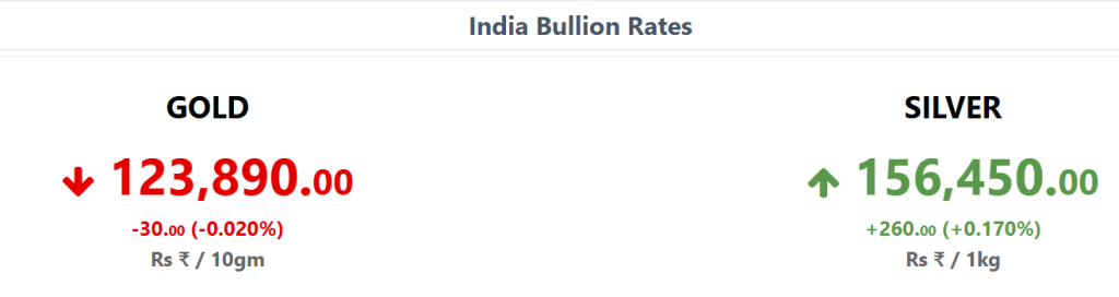 सुबह 9:10 बजे MCX Gold दिसंबर फ्यूचर्स 0.21% टूटकर ₹1,23,300 प्रति 10 ग्राम पर ट्रेड कर रहा था. वहीं MCX Silver दिसंबर कॉन्ट्रैक्ट्स 0.38% गिरकर ₹1,55,424 प्रति किलोग्राम पर पहुंच गए. हालांकि इंटरनेशनल मार्केट में आज सोना चढ़ा हुआ नजर आया. ये 0.21 फीसदी की बढ़त के साथ 4,082 डॉलर प्रति औंस पर कारोबार करता नजर आया.