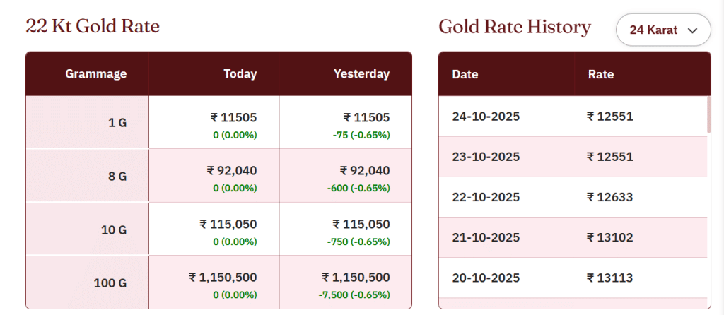 रिटेल कीमतों पर नजर डालें तो तनिष्क की वेबसाइट पर 24 अक्टूबर को 24 कैरेट गोल्ड के भाव 125510 रुपये प्रति 10 ग्राम दर्ज की गई. 23 अक्टूबर को भी यही भाव थे, यानी रिटेल लेवल पर इसमें कोई बदलाव नहीं हुआ है. जबकि 22 कैरेट गोल्ड के रेट 115050 रुपये प्रति 10 ग्राम दर्ज किए गए.