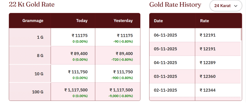 तनिष्क की वेबसाइट पर 24 कैरेट गोल्ड 6 नवंबर को 121910 रुपये प्रति 10 ग्राम दर्ज किया गया. वहीं 22 कैरेट सोना 111750 रुपये प्रति 10 ग्राम पर मिल रहा था. बुलियन वेबसाइट के मुताबिक रिटेल में चांदी की कीमत 147,950 रुपये प्रति किलो दर्ज की गई. इसमें 80 रुपये की मामूली बढ़ोतरी देखने को मिली.