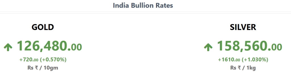 MCX दिसंबर गोल्ड 10 ग्राम ₹1,25,835 पर 0.50% की तेजी के साथ ट्रेड कर रहा था. यानी ये करीब 600 रुपये से ज्यादा महंगा हो गया, जबकि MCX दिसंबर सिल्वर 1 किग्रा ₹1,57,750 पर 0.91% ऊपर था. आज चांदी 1419 रुपये महंगी हो गई. वहीं इंटरनेशनल मार्केट में आज स्पॉट गोल्ड 1.72 फीसदी तेजी के साथ 4,165 डॉलर प्रति औंस पर करोबार करता नजर आया.