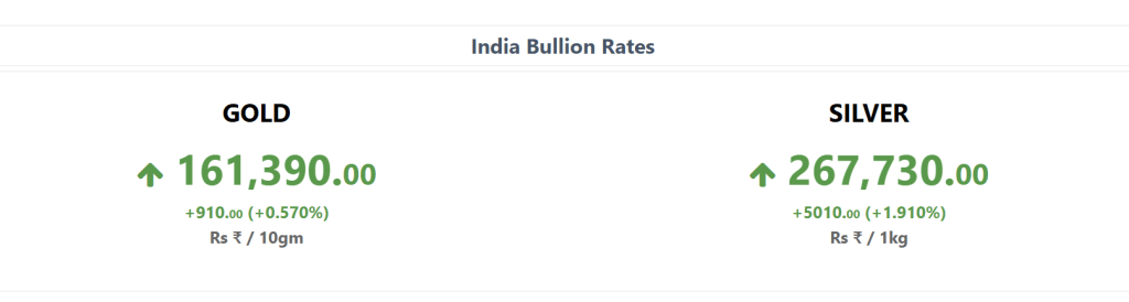 रिटेल लेवल पर देखें तो बुलियन वेबसाइट के मुताबिक 24 कैरेट सोना 910 रुपये महंगा होकर 161,390 रुपये प्रति 10 ग्राम पर पहुंच गया. वहीं चांदी के रेट 5010 रुपये बढ़कर 267,730 रुपये प्रति किलो हो गए हैं.