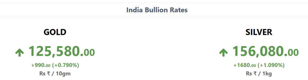 मल्टी कमोडिटी एक्सचेंज यानी MCX पर आज 24 कैरेट सोना 1318 रुपये चढ़कर 125,288 रुपये प्रति 10 ग्राम पर कारोबार करता नजर आया. वहीं चांदी भी 2,365 रुपये महंगी होगर 156,056 रुपये प्रतिकिलो पर पहुंच गई. इंटरनेशनल लेवल पर नजर डालें तो मंगलवार को स्पॉट गोल्ड 3.59 फीसदी उछाल के साथ 4,144 डॉलर प्रति औंस पर कारोबार करता नजर आया. अंतरराष्ट्रीय बाजार में सोने की कीमतें करीब तीन हफ्तों के उच्च स्तर पर पहुंच गई है.
