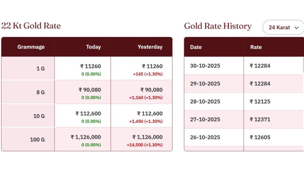 तनिष्क की वेबसाइट के मुताबिक 30 अक्टूबर को 24 कैरेट सोना ₹12284 पर मिल रहा था, वहीं 29 अक्टूबर को भी इसके यही रेट थे. यानी कीमतों में कोई बदलाव नहीं हुआ. जबकि 22 कैरेट सोने की कीमतें ₹11260 दर्ज की गई. बुलियन वेबसाइट के मुताबिक रिटेल में चांदी के भाव 30 अक्टूबर को 145,190 रुपये प्रति किलो दर्ज की गई. आज ये 1360 रुपये सस्ता हुआ है.
