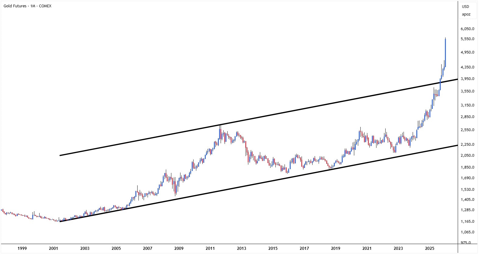 अमेरिका के COMEX एक्सचेंज पर सोने के चार्ट ने बड़ा संकेत दिया है. पिछले 25 साल से सोना एक तय दायरे में ऊपर नीचे हो रहा था. लेकिन अब उसने उस दायरे की ऊपरी सीमा को तोड़ दिया है. तकनीकी भाषा में इसे ब्रेकआउट कहा जाता है.
