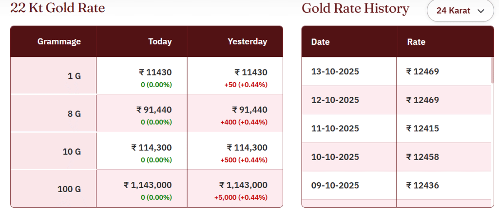 तनिष्क की वेबसाइट पर आज 24 कैरेट सोने की कीमत 124690 रुपये प्रति 10 ग्राम पर कारोबार करता नजर आया. जबकि 12 अक्टूबर को भी इसके यही रेट थे, यानी रिटेल में कीमतों में कोई बदलाव नहीं आया. वहीं 22 कैरेट गोल्ड की कीमत आज तनिष्क की वेबसाइट पर 114300 रुपये प्रति 10 ग्राम दर्ज की गई. इसके रेट में भी कोई बदलााव नहीं हुआ.