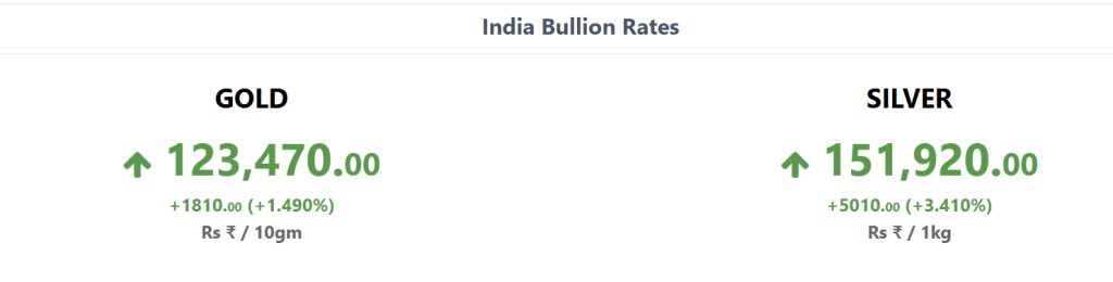 Gold and Silver rate today: सोने की चमक आजकल इतनी तेज हो गई कि हर रोज ये नया रिकॉर्ड बना रहा है. सोने के अलावा चांदी की भी चमक लगातार बढ़ रही है और दिवाली की दस्तक से पहले ही इन कीमती धातुओं के रेट में जबरदस्त उछाल देखने को मिल रहा है. यही वजह है कि मल्टी कमोडिटी एक्सचेंज यानी MCX पर सोमवार, 13 अक्टूबर को सोना 1949 रुपये चढ़कर 123,313 रुपये प्रति 10 ग्राम पर कारोबार करता नजर आया. वहीं चांदी भी एक दिन में 5,566 रुपये उछलकर 152,032 रुपये प्रति किलो पर कारोबार करती नजर आई.