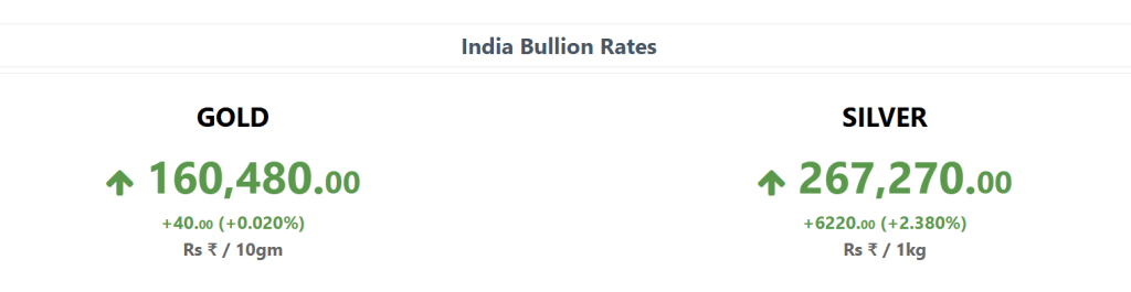 बुलियन वेबसाइट के मुताबिक 27 फरवरी को 24 कैरेट गोल्ड 0.20 फीसदी की हल्की बढ़त के साथ 160,480 रुपये प्रति 10 ग्राम पर कारोबार करता दिखा. वहीं चांदी 2.380 फीसदी महंगी होकर 267,270 रुपये प्रति किलो पर मिल रही थी.
