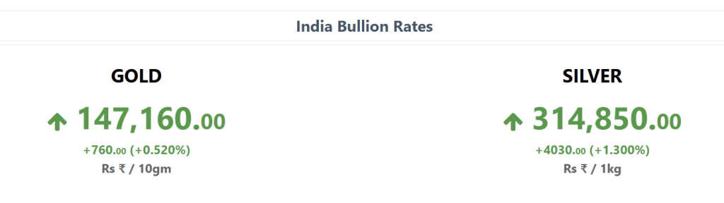 बुलियन वेबसाइट के मुताबिक 24 कैरेट सोना 760 रुपये चढ़कर 147,160 रुपये प्रति 10 ग्राम पर मिल रहा था. वहीं चांदी 4030 रुपये महंगी होकर 314,850 रुपये प्रति किलो पर कारोबार कर रही थी.