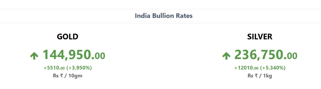 बुलियन वेबसाइट के मुताबिक सोना 5510 रुपये चढ़कर 144,950 रुपये प्रति 10 ग्राम पर ट्रेड करता नजर आया. वहीं चांदी 12010 रुपये उछलकर 236,750 रुपये प्रति किलो पर पहुंच गई है.