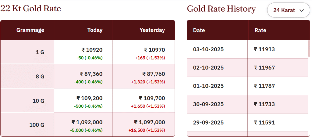 तनिष्क की वेबसाइट पर हफ्ते के आखिरी कारोबारी दिन शुक्रवार यानी 3 अक्टूबर को 24 कैरेट सोने की कीमत ₹119130 प्रति 10 ग्राम दर्ज किया गया, जबकि 2 अक्टूगर को इसकी कीमत ₹119670 प्रति 10 ग्राम थी. यानी आज इसके रेट में गिरावट देखने को मिली. 22 कैरेट सोने की बात करें तो आज इसकी कीमत ₹109200 प्रति 10 ग्राम दर्ज की गई. इसके रेट कल ₹109700 रुपये प्रति 10 ग्राम थी.