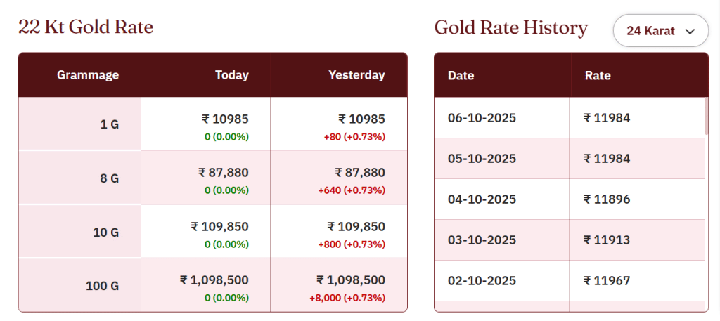 तनिष्क की वेबसाइट पर 6 अक्टूबर को 24 कैरेट सोने की कीमत 119840 रुपये प्रति 10 ग्राम दर्ज की गई, जबकि 5 अक्टूबर को भी इतनी कीमत थी, यानी रिटेल लेवल पर आज सोने की कीमतों में कोई बदलाव नहीं हुआ है. 22 कैरेट सोना भी तनिष्क की वेबसाइट पर 109850 रुपये प्रति 10 ग्राम पर मिल रहा था, इसकी कीमत में भी कोई बदलाव नहीं हुआ है.