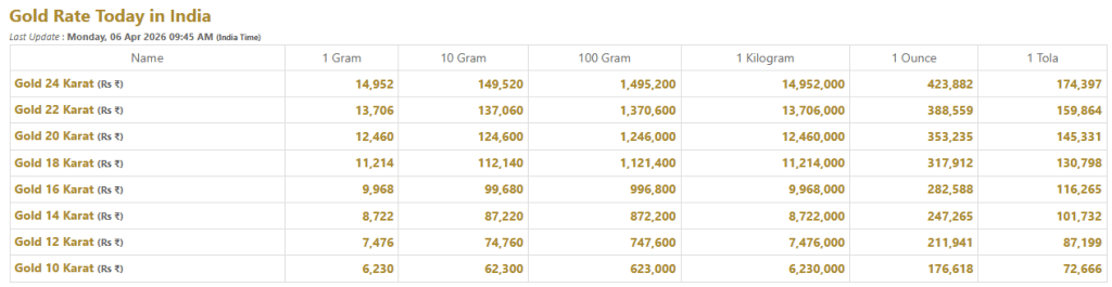 अप्रैल के पहले हफ्ते में सोने की कीमतों में करीब 1.3 प्रतिशत की गिरावट आई है. इससे पहले मार्च में सोना करीब 14 प्रतिशत तक गिर चुका है. Bullians.in के मुताबिक रिटेल में 6 अप्रैल 2026 को 24 कैरेट सोना करीब ₹149,520 प्रति 10 ग्राम पर है. 22 कैरेट सोना ₹1,370,600 और 18 कैरेट सोना ₹1,121,400 प्रति 10 ग्राम के आसपास बना हुआ है.