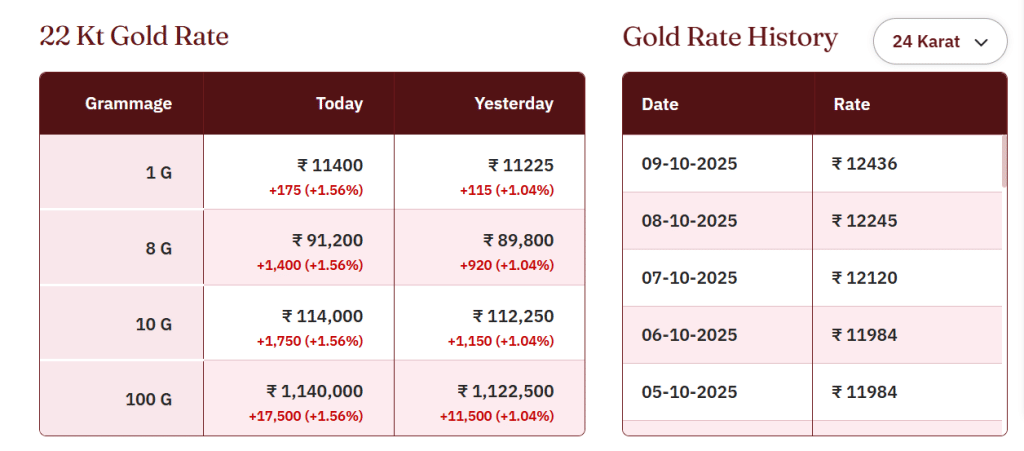 रिटेल लेवल पर देखें तो तनिष्क की वेबसाइट पर 9 अक्टूबर को 24 कैरेट सोने की कीमत 124360 रुपये प्रति 10 ग्राम दर्ज की गई, वहीं 8 अक्टूबर को ये 122450 रुपये प्रति 10 ग्राम था, यानी आज इसकी कीमतें बढ़ी है. वहीं 22 कैरेट सोना 114000 रुपये प्रति 10 ग्राम पर आज मिल रहा है, कल इसकी कीमत 112250 रुपये प्रति 10 ग्राम थी.