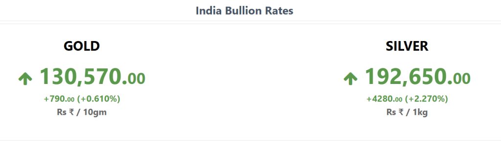 रिटेल लेवल पर देखें तो कैरेटलेन पर 22 कैरेट वाला सोना 12310 रुपये प्रति ग्राम पर मिल रहा है. जबकि बुलियन वेबसाइट के मुताबिक सोना आज 790 रुपये महंगा होगर 130,570 रुपये प्रति 10 ग्राम पर पहुंच गया. जबकि चांदी 4280 रुपये चढ़कर 192,650 रुपये पर कारोबार करती दिखी.