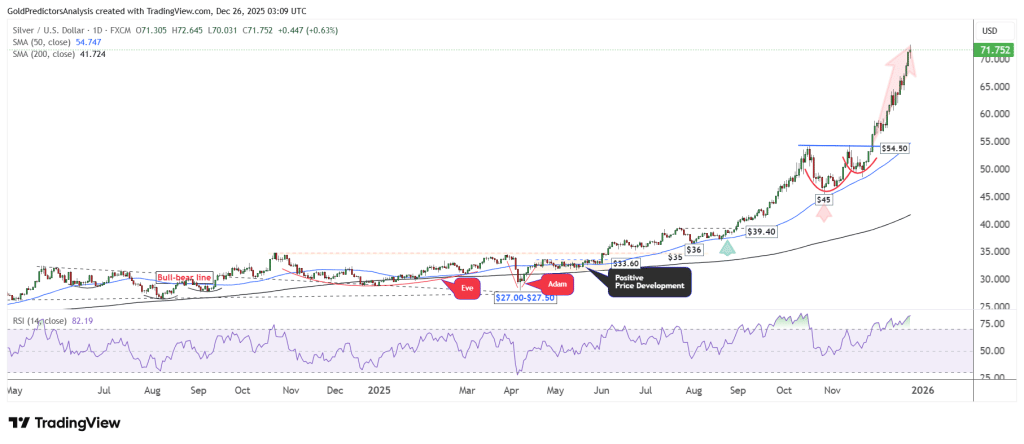 चांदी की कहानी और भी दिलचस्प है. डेली चार्ट पर कई मजबूत बुलिश पैटर्न बने हैं, जिनसे साफ है कि लंबी अवधि का ट्रेंड ऊपर की ओर है. 54.50 डॉलर के ऊपर ब्रेकआउट के बाद चांदी ने तेज रफ्तार पकड़ी और सीधे 70 डॉलर तक पहुंच गई.