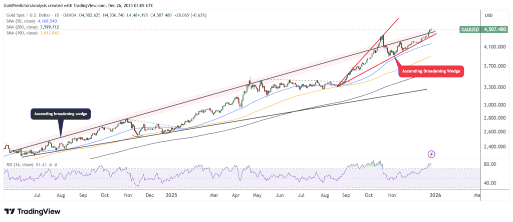 टेक्निकल चार्ट पर सोने की स्थिति काफी मजबूत नजर आ रही है. FXEMPIRE की रिपोर्ट के मुताबिक, डेली चार्ट में सोने की कीमत एक अहम रेजिस्टेंस को तोड़कर ऊपर निकल चुकी है और अब नया बुलिश स्ट्रक्चर बनता दिख रहा है. हाल ही में सोने ने 4,380 डॉलर का ऑल-टाइम हाई पार किया, जो यह संकेत देता है कि अगला बड़ा लक्ष्य 5,000 डॉलर हो सकता है.