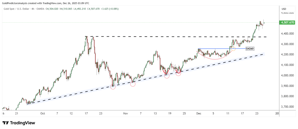 रिपोर्ट के मुताबिक, 4-घंटे के चार्ट पर देखा जाए तो सोना 4,380 डॉलर के आसपास बने पैटर्न से ऊपर निकल चुका है और अब 4,500 डॉलर के पास कंसोलिडेट कर रहा है. क्रिसमस के आसपास बने रिकॉर्ड स्तरों के करीब ही कीमत ठहरी हुई है. ऐसे में अगर सोना वापस 4,380 डॉलर तक आता है, तो निवेशकों के लिए यह मजबूत सपोर्ट माना जा रहा है.