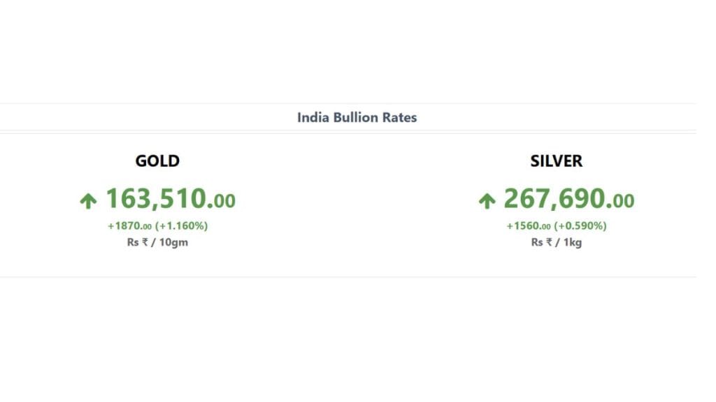 Gold Rate Today: सोने और चांदी की कीमतों में आज तेजी दर्ज की गई है. घरेलू बाजार में गोल्ड और सिल्वर दोनों मजबूत स्तर पर कारोबार कर रहे हैं. 24 कैरेट सोना के कीमतों में 1.1 फीसदी की तेजी देखने को मिली है जिसके बाद यह 163510 रुपये प्रति 10 ग्राम पर पहुंच गया है. वहीं चांदी 267690 रुपये प्रति किलो के स्तर पर है. वैश्विक बाजार में भी तेजी का असर भारतीय बाजार पर साफ दिख रहा है. निवेशक सुरक्षित निवेश के तौर पर सोने की ओर रुख कर रहे हैं.