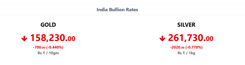 MCX पर सोना ₹1,58,755 के पिछले बंद भाव के मुकाबले गिरकर ₹1,58,000 प्रति 10 ग्राम पर खुला. वहीं चांदी ₹2,63,018 से फिसलकर ₹2,61,361 प्रति किलोग्राम पर ओपन हुई. बाद में सोना दिन के निचले स्तर ₹1,57,701 तक पहुंच गया, जबकि चांदी करीब 1% टूटकर ₹2,60,453 प्रति किलो पर आ गई. इस लिहाज से सोना करीब 800 रुपये और चांदी 2500 रुपये से ज्यादा सस्ती हो गई.