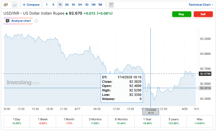 डॉलर के मुकाबले भारतीय रुपया 92.678 के स्तर पर ट्रेड कर रहा है, जिसमें 0.080 यानी 0.09% की हल्की बढ़त दर्ज की गई है. यह संकेत देता है कि रुपये में थोड़ी मजबूती आई है और डॉलर के मुकाबले इसकी स्थिति बेहतर हुई है.