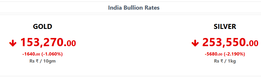 Bullians.co.in के मुताबिक आज सोने और चांदी दोनों की कीमतों में गिरावट देखने को मिली है. सोना ₹1,53,270 प्रति 10 ग्राम पर ट्रेड कर रहा है, जिसमें ₹1,640 यानी 1.06% की कमी दर्ज की गई है. वहीं चांदी की कीमत ₹2,53,550 प्रति किलोग्राम पर पहुंच गई है, जिसमें ₹5,680 यानी 2.19% की गिरावट देखी गई है. दोनों कीमती धातुओं में कमजोरी का रुख बना हुआ है.