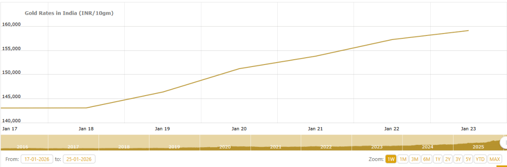 17 जनवरी को 24 कैरेट वाले 10 ग्राम सोने की कीमत 1,43,080 रुपये थी जो 23 जनवरी को बढ़कर 1,59,130 रुपये पर पहुंच गई. यानी 6 दिन में सोना 16,000 रुपये महंगा हुआ. चांदी की बात करें तो बीते 6 दिन में यह 47,510 रुपये महंगी हुई है.
