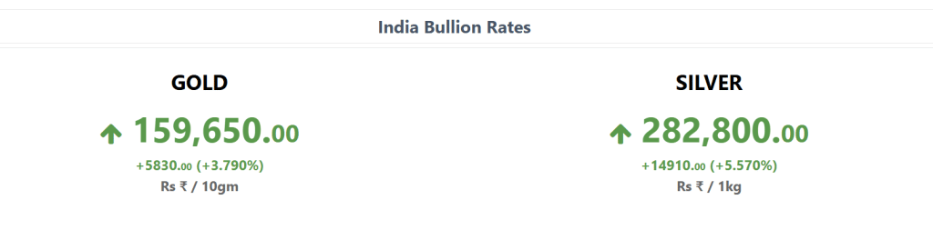 मल्टी कमोडिटी एक्सचेंज यानी MCX पर गोल्ड अप्रैल फ्यूचर ₹6,084 यानी 3.96% चढ़कर ₹1,59,893 प्रति 10 ग्राम पर कारोबार कर रहा था. वहीं सिल्वर मार्च कॉन्ट्रैक्ट ₹281,899 रुपये प्रति किलो पर ट्रेड कर रही थी. इसमें 5.18% उछाल दर्ज की गई. आज ये 13,884 रुपये महंगी हो गई.