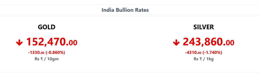 बुलियन वेबाइट पर सोना 1330 रुपये गिरकर 152,470 रुपये प्रति 10 ग्राम पर कारोबार करता नजर आया, जबकि चांदी की कीमत 243,860 रुपये प्रति किलो पर कारोबार करती नजर आई. इसमें 4310 रुपये की गिरावट देखने को मिली.
