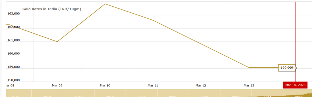 बुलियन वेबसाइट के मुताबिक 9 मार्च को 24 कैरेट गोल्ड की कीमत 1,61,000 रुपये प्रति 10 ग्राम दर्ज की गई थी, जबकि 13 मार्च को यह 159,600 रुपये प्रति 10 ग्राम पर बंद हुआ था. इस लिहाज से सोना इस हफ्ते ₹1,400 प्रति 10 ग्राम सस्ता हो गया.