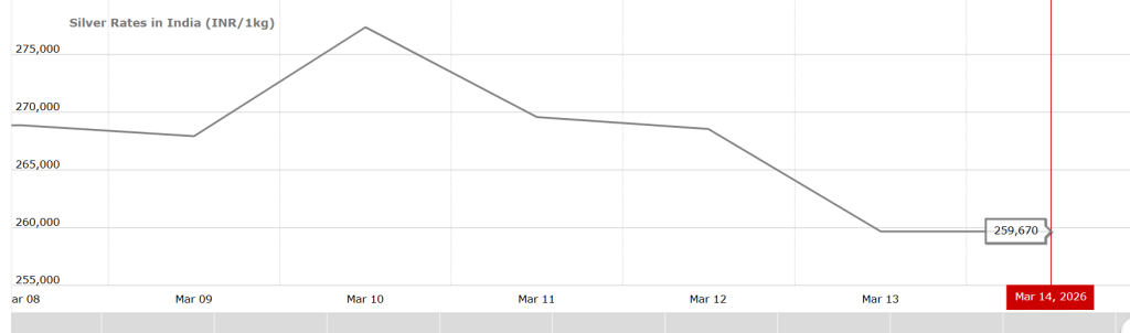 वहीं चांदी की कीमत 9 मार्च को 267,920 रुपये प्रति किलो दर्ज की गई थी. वहीं 13 मार्च को ये 259,670 रुपये प्रति किलो पर बंद हुई. इस लिहाज से हफ्ते भर के अंदर चांदी की कीमतें ₹8,250 प्रति किलो सस्ती हो गई है.