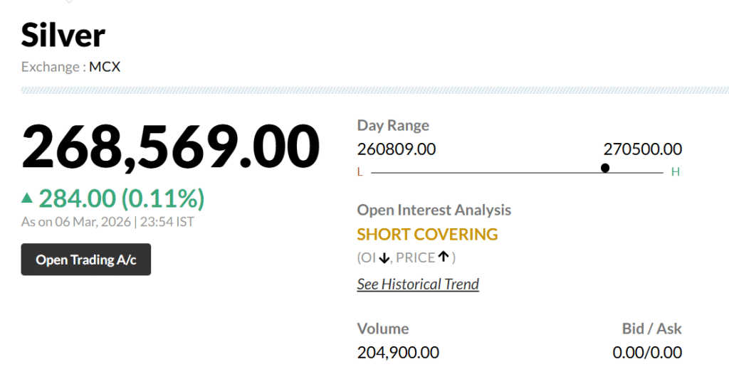 मल्टी कमोडिटी एक्सचेंज यानी MCX पर सोने-चांदी में बीते दो दिनों से तेजी देखने को मिली है. 6 मार्च को एमसीएक्स पर सोना 41 रुपये की मामूली बढ़त के साथ 161,675 रुपये प्रति 10 ग्राम पर बंद हुआ था. वहीं चांदी भी 284 रुपये की बढ़ते के साथ 268,569 रुपये प्रति किलो पर बंद हुई थी.
