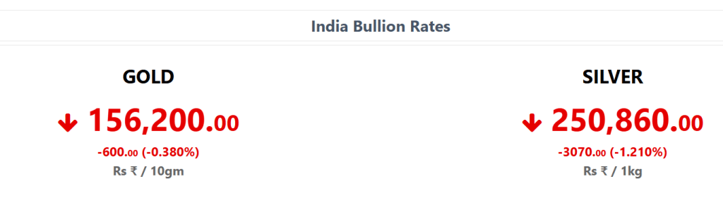 बुलियन वेबसाइट पर 18 मार्च को 24 कैरेट सोना 600 रुपये गिरकर 156,200 रुपये प्रति 10 ग्राम पर कारोबार कर रहा था. वहीं चांदी 3070 रुपये गिरकर 250,860 रुपये प्रति किलो पर कारोबार करती नजर आई.