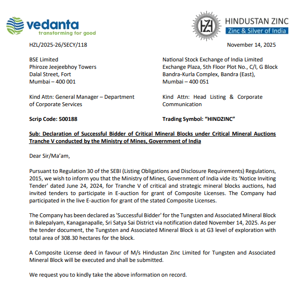 हिंदुस्तान जिंक लिमिटेड (HZL) को आंध्र प्रदेश में टंगस्टन की खोज और माइनिंग के लिए कम्पोजिट लाइसेंस मिला है. यह कदम कंपनी के लिए क्रिटिकल और हाई-वैल्यू मिनरल सेक्टर में प्रवेश का बड़ा अवसर है. मजबूत वित्तीय प्रदर्शन और बढ़ते कैश फ्लो से कंपनी इस विस्तार को गति दे पाएगी. जानें क्या है शेयर का हाल.