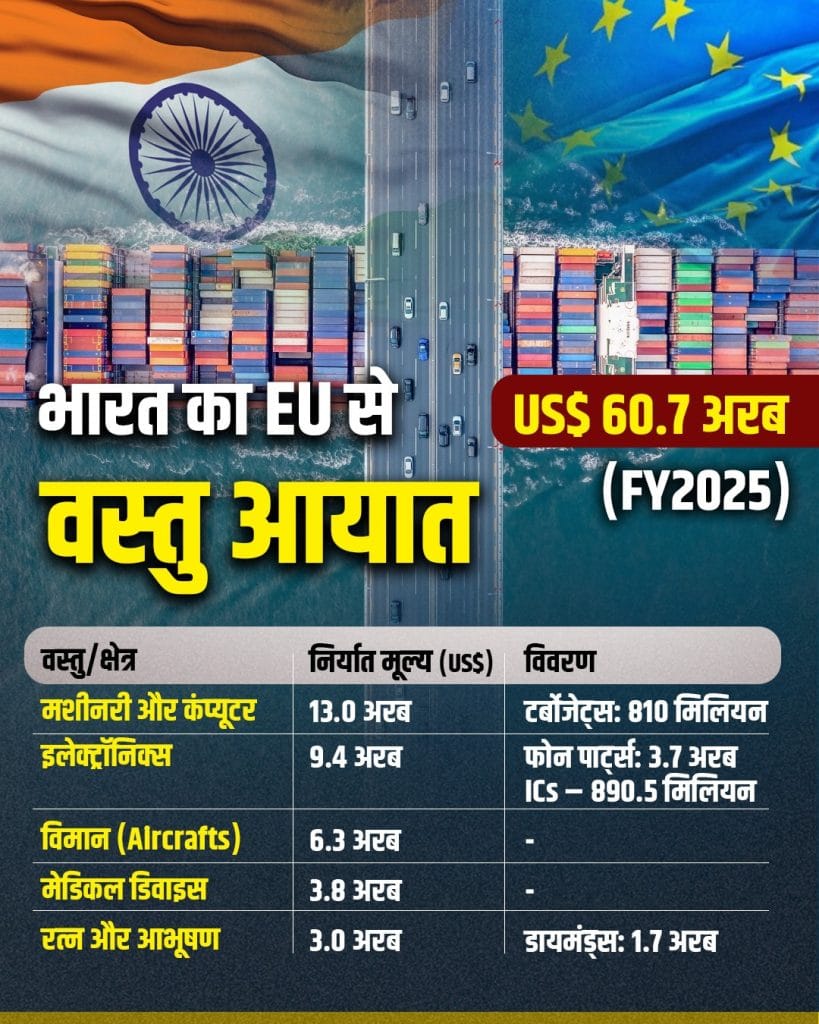 - FY2025 में भारत ने EU को लगभग 76 अरब डॉलर का सामान एक्सपोर्ट किया, जबकि 61 अरब डॉलर का इंपोर्ट किया, जिससे ट्रेड सरप्लस हुआ. लेकिन 2023 में EU GSP लाभ वापस लेने से कई भारतीय प्रोडक्ट्स के लिए कॉम्पिटिटिवनेस कम हो गई है.