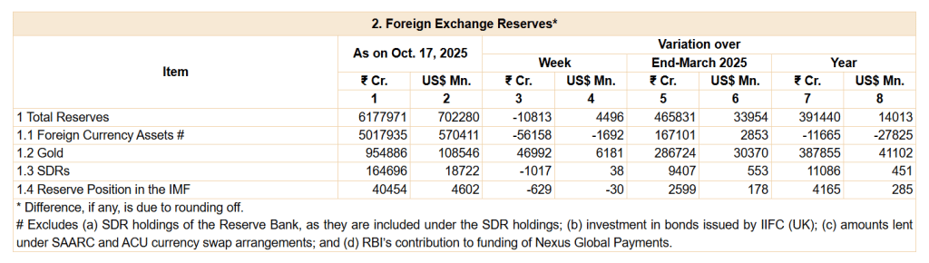 RBI के ताजा आंकड़ों के मुताबिक भारत का विदेशी मुद्रा भंडार 17 अक्टूबर, 2025 तक 702.28 अरब डॉलर तक पहुंच गया है. सप्ताह-दर-सप्ताह भंडार में 4.5 अरब डॉलर की वृद्धि हुई है.