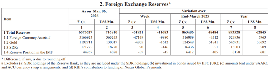 भारतीय रिजर्व बैंक (RBI) के ताजा आंकड़ों के मुताबिक 6 मार्च को समाप्त सप्ताह में भारत का विदेशी मुद्रा भंडार 11.68 अरब डॉलर घटकर 716.81 अरब डॉलर रह गया. इससे पहले यह रिकॉर्ड 728.49 अरब डॉलर तक पहुंच गया था. गिरावट की सबसे बड़ी वजह फॉरेन करेंसी एसेट्स में कमी रही, जबकि गोल्ड रिजर्व, SDR और IMF पोजिशन में भी हल्की गिरावट दर्ज की गई है.