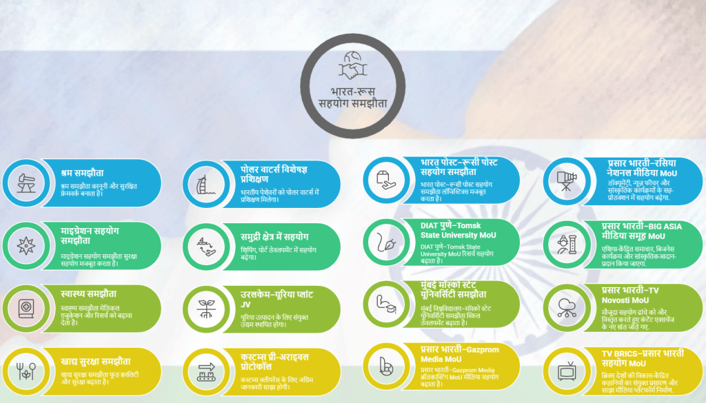 India–Russia Summit 2025 में 16 अहम समझौते और 5 बड़े ऐलान हुए. माइग्रेशन, हेल्थ, फूड सेफ्टी, पोलर शिपिंग, फर्टिलाइजर JV, कस्टम्स डेटा शेयरिंग, अकादमिक व मीडिया सहयोग जैसे क्षेत्रों में नई साझेदारी बनी. रूस ने International Big Cat Alliance से जुड़ने का निर्णय लिया और भारतीय वीजा नीति में भी बड़े बदलाव घोषित हुए.