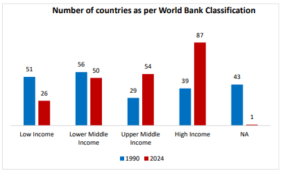पिछले दशक में भारत की Economic growth दुनिया के मुकाबले बेहतर रही है. ग्लोबल ग्रोथ रैंकिंग में भारत 95वें परसेंटाइल में पहुंच चुका है, यानी दुनिया के सबसे तेज बढ़ते देशों में शामिल है. वर्ल्ड बैंक देशों को चार Categories में बांटता है. साल 1990 में सिर्फ 39 देश हाई-इनकम थे, लेकिन साल 2024 तक यह संख्या बढ़कर 87 हो गई है. यानी दुनिया के कई देश तेजी से आगे बढ़ रहे हैं, और भारत भी उसी दिशा में है.